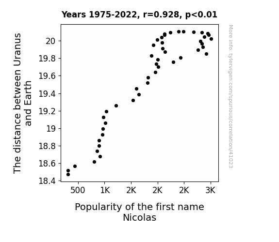 This means 86.1% of the change in the one variable (i.e., Popularity of the first name Nicolas) is predictable based on the change in the other (i.e., The distance between Uranus and Earth) over the 48 years from 1975 through 2022.