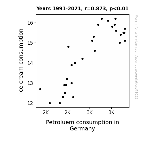 This means 76.2% of the change in the one variable (i.e., Petroluem consumption in Germany) is predictable based on the change in the other (i.e., Ice cream consumption) over the 31 years from 1991 through 2021.