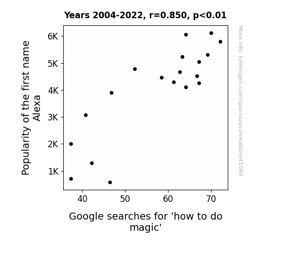 This means 72.2% of the change in the one variable (i.e., Google searches for 'how to do magic') is predictable based on the change in the other (i.e., Popularity of the first name Alexa) over the 19 years from 2004 through 2022.