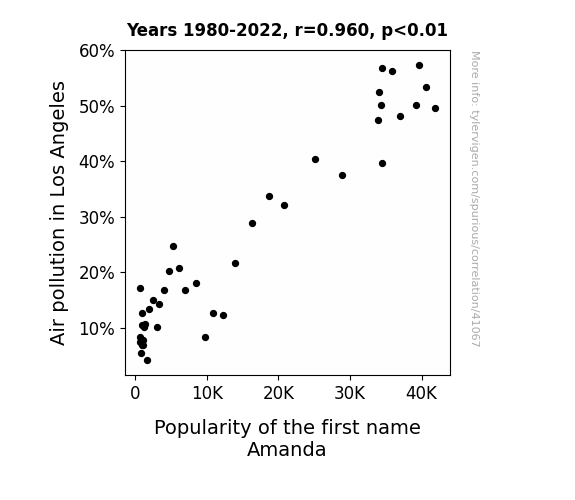 This means 92.2% of the change in the one variable (i.e., Popularity of the first name Amanda) is predictable based on the change in the other (i.e., Air pollution in Los Angeles) over the 43 years from 1980 through 2022.