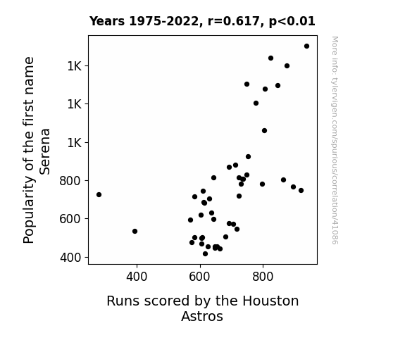 This means 38.1% of the change in the one variable (i.e., Runs scored by the Houston Astros) is predictable based on the change in the other (i.e., Popularity of the first name Serena) over the 48 years from 1975 through 2022.