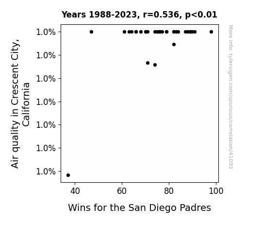 This means 28.8% of the change in the one variable (i.e., Wins for the San Diego Padres) is predictable based on the change in the other (i.e., Air quality in Crescent City, California) over the 36 years from 1988 through 2023.