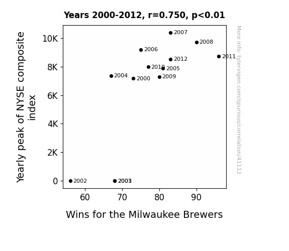 This means 56.3% of the change in the one variable (i.e., Wins for the Milwaukee Brewers) is predictable based on the change in the other (i.e., Yearly peak of NYSE composite index) over the 13 years from 2000 through 2012.