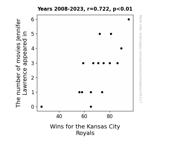 This means 52.1% of the change in the one variable (i.e., Wins for the Kansas City Royals) is predictable based on the change in the other (i.e., The number of movies Jennifer Lawrence appeared in) over the 16 years from 2008 through 2023.