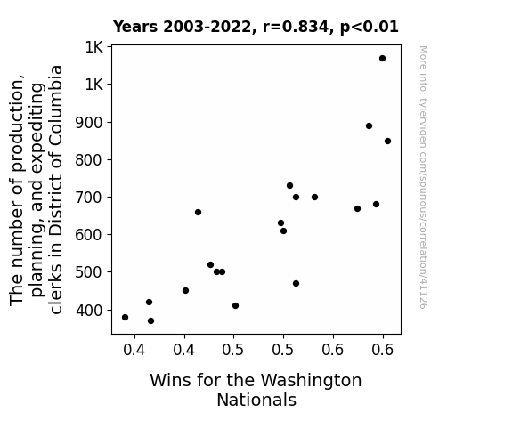 This means 69.5% of the change in the one variable (i.e., Wins for the Washington Nationals) is predictable based on the change in the other (i.e., The number of production, planning, and expediting clerks in District of Columbia) over the 20 years from 2003 through 2022.
