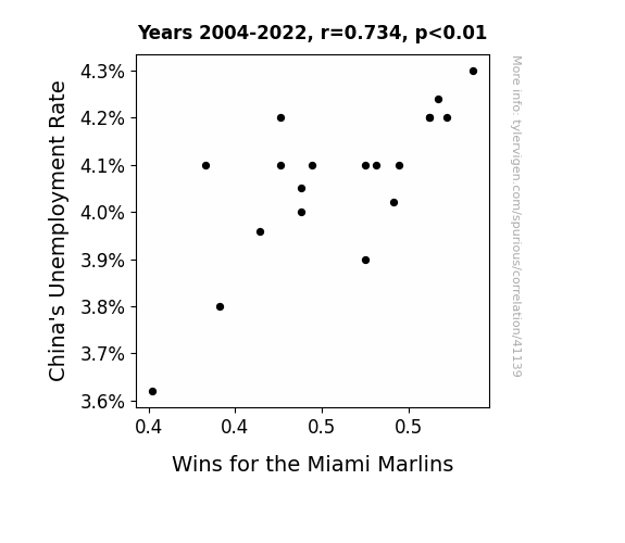 This means 53.9% of the change in the one variable (i.e., Wins for the Miami Marlins) is predictable based on the change in the other (i.e., China's Unemployment Rate) over the 19 years from 2004 through 2022.