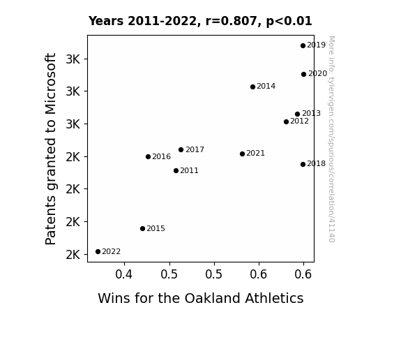 This means 65.2% of the change in the one variable (i.e., Wins for the Oakland Athletics) is predictable based on the change in the other (i.e., Patents granted to Microsoft) over the 12 years from 2011 through 2022.