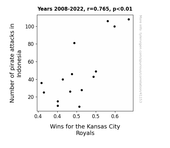 This means 58.5% of the change in the one variable (i.e., Wins for the Kansas City Royals) is predictable based on the change in the other (i.e., Number of pirate attacks in Indonesia) over the 15 years from 2008 through 2022.