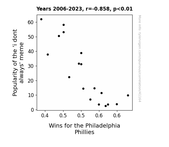 This means 73.6% of the change in the one variable (i.e., Wins for the Philadelphia Phillies) is predictable based on the change in the other (i.e., Popularity of the 'i dont always' meme) over the 18 years from 2006 through 2023.