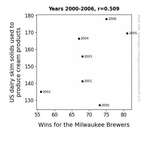 This means 25.9% of the change in the one variable (i.e., Wins for the Milwaukee Brewers) is predictable based on the change in the other (i.e., US dairy skim solids used to produce cream products) over the 7 years from 2000 through 2006.