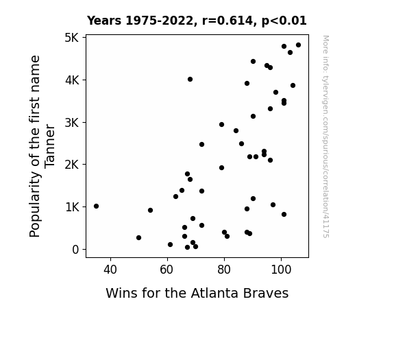 This means 37.7% of the change in the one variable (i.e., Wins for the Atlanta Braves) is predictable based on the change in the other (i.e., Popularity of the first name Tanner) over the 48 years from 1975 through 2022.