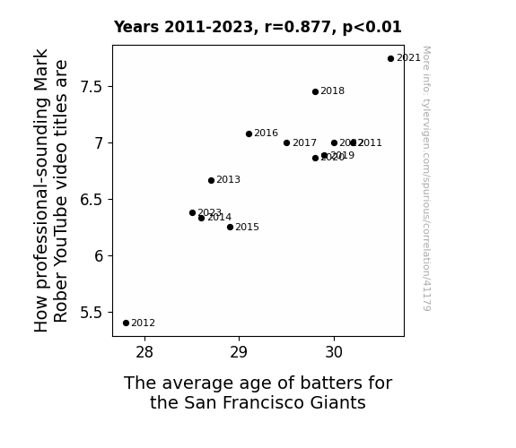 This means 76.9% of the change in the one variable (i.e., The average age of batters for the San Francisco Giants) is predictable based on the change in the other (i.e., How professional-sounding Mark Rober YouTube video titles are) over the 13 years from 2011 through 2023.