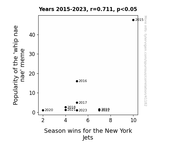 This means 50.6% of the change in the one variable (i.e., Season wins for the New York Jets) is predictable based on the change in the other (i.e., Popularity of the 'whip nae nae' meme) over the 9 years from 2015 through 2023.