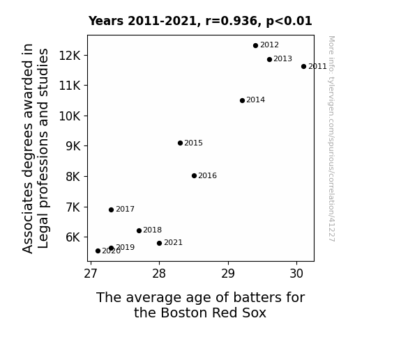 This means 87.6% of the change in the one variable (i.e., The average age of batters for the Boston Red Sox) is predictable based on the change in the other (i.e., Associates degrees awarded in Legal professions and studies) over the 11 years from 2011 through 2021.