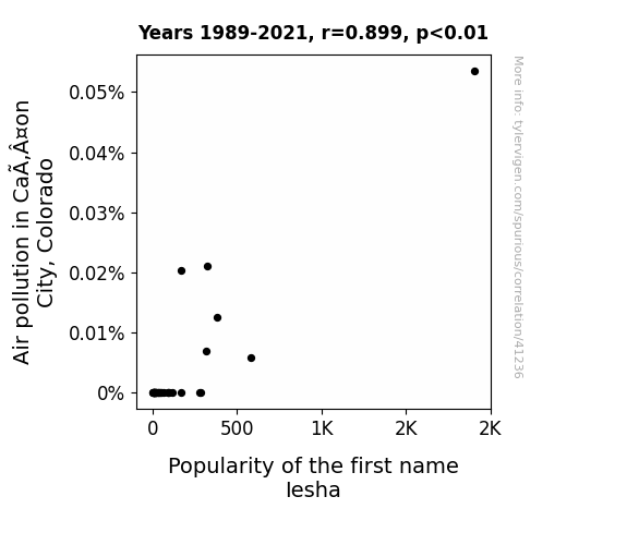 This means 80.8% of the change in the one variable (i.e., Popularity of the first name Iesha) is predictable based on the change in the other (i.e., Air pollution in Ca¤on City, Colorado) over the 33 years from 1989 through 2021.