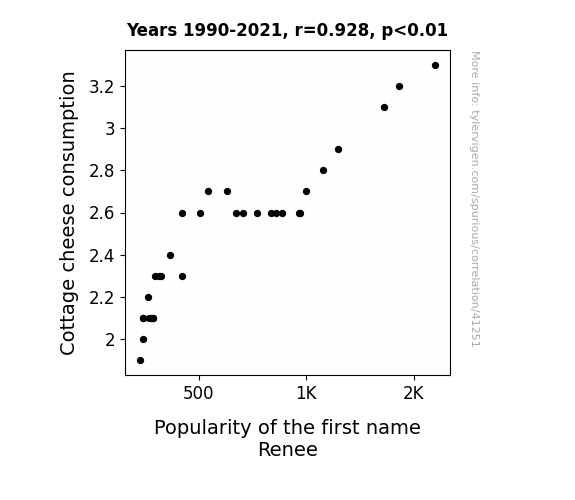 This means 86.1% of the change in the one variable (i.e., Popularity of the first name Renee) is predictable based on the change in the other (i.e., Cottage cheese consumption) over the 32 years from 1990 through 2021.