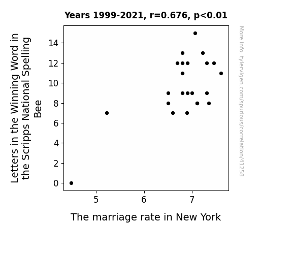 This means 45.8% of the change in the one variable (i.e., The marriage rate in New York) is predictable based on the change in the other (i.e., Letters in the Winning Word in the Scripps National Spelling Bee) over the 23 years from 1999 through 2021.