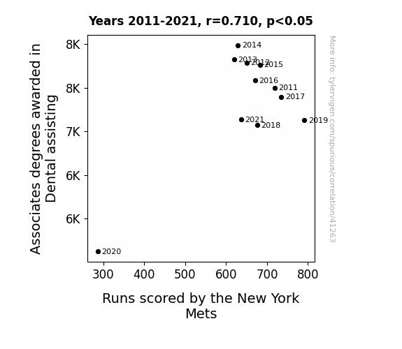 This means 50.3% of the change in the one variable (i.e., Runs scored by the New York Mets) is predictable based on the change in the other (i.e., Associates degrees awarded in Dental assisting) over the 11 years from 2011 through 2021.