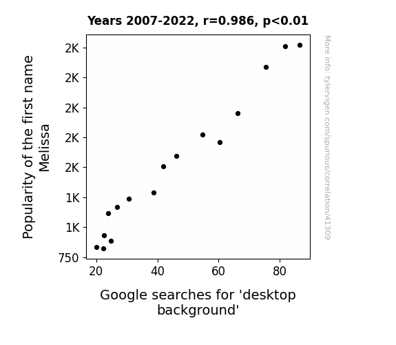This means 97.3% of the change in the one variable (i.e., Google searches for 'desktop background') is predictable based on the change in the other (i.e., Popularity of the first name Melissa) over the 16 years from 2007 through 2022.