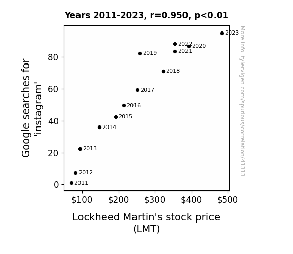 This means 90.3% of the change in the one variable (i.e., Lockheed Martin's stock price (LMT)) is predictable based on the change in the other (i.e., Google searches for 'instagram') over the 13 years from 2011 through 2023.