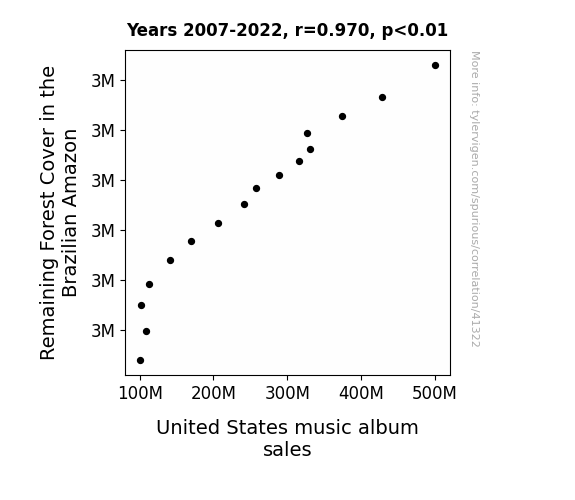 This means 94.1% of the change in the one variable (i.e., United States music album sales) is predictable based on the change in the other (i.e., Remaining Forest Cover in the Brazilian Amazon) over the 16 years from 2007 through 2022.