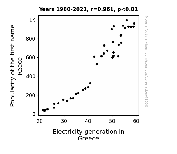 This means 92.3% of the change in the one variable (i.e., Electricity generation in Greece) is predictable based on the change in the other (i.e., Popularity of the first name Reece) over the 42 years from 1980 through 2021.