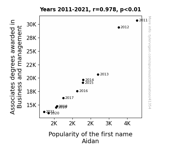 This means 95.6% of the change in the one variable (i.e., Popularity of the first name Aidan) is predictable based on the change in the other (i.e., Associates degrees awarded in Business and management) over the 11 years from 2011 through 2021.