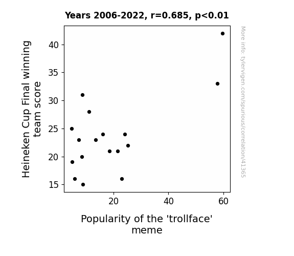 This means 46.9% of the change in the one variable (i.e., Popularity of the 'trollface' meme) is predictable based on the change in the other (i.e., Heineken Cup Final winning team score) over the 17 years from 2006 through 2022.