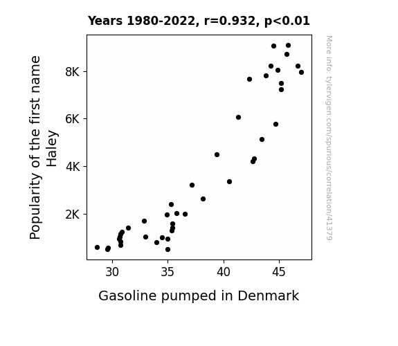 This means 86.9% of the change in the one variable (i.e., Gasoline pumped in Denmark) is predictable based on the change in the other (i.e., Popularity of the first name Haley) over the 43 years from 1980 through 2022.