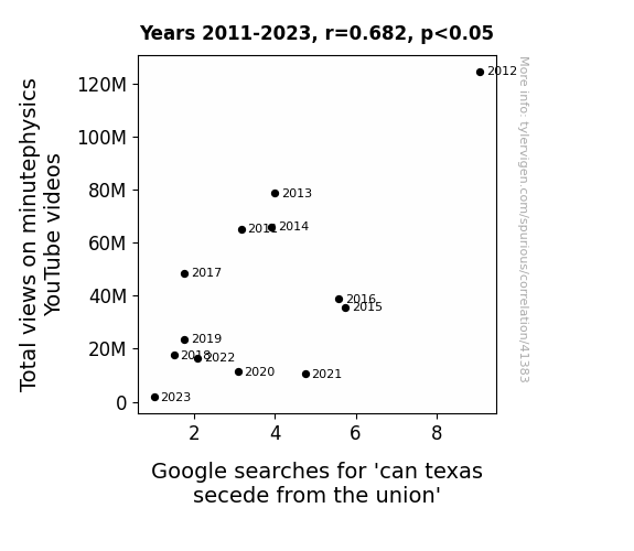 This means 46.6% of the change in the one variable (i.e., Google searches for 'can texas secede from the union') is predictable based on the change in the other (i.e., Total views on minutephysics YouTube videos) over the 13 years from 2011 through 2023.