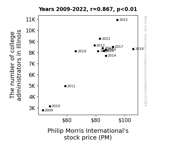 This means 75.2% of the change in the one variable (i.e., Philip Morris International's stock price (PM)) is predictable based on the change in the other (i.e., The number of college administrators in Illinois) over the 14 years from 2009 through 2022.