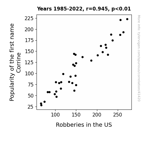 This means 89.3% of the change in the one variable (i.e., Robberies in the US) is predictable based on the change in the other (i.e., Popularity of the first name Corrine) over the 38 years from 1985 through 2022.
