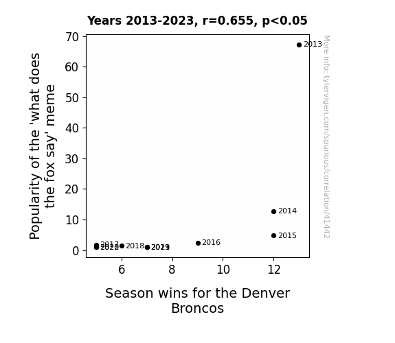 This means 42.9% of the change in the one variable (i.e., Season wins for the Denver Broncos) is predictable based on the change in the other (i.e., Popularity of the 'what does the fox say' meme) over the 11 years from 2013 through 2023.