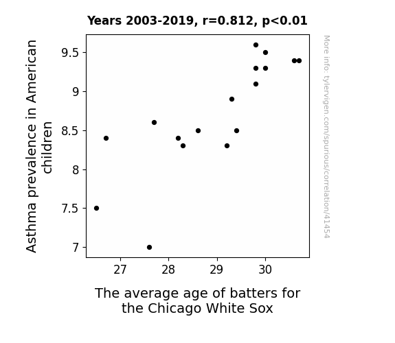 This means 66% of the change in the one variable (i.e., The average age of batters for the Chicago White Sox) is predictable based on the change in the other (i.e., Asthma prevalence in American children) over the 17 years from 2003 through 2019.