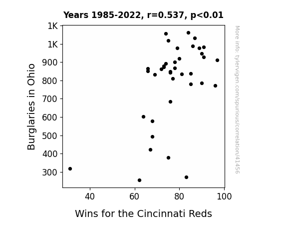 This means 28.8% of the change in the one variable (i.e., Wins for the Cincinnati Reds) is predictable based on the change in the other (i.e., Burglaries in Ohio) over the 38 years from 1985 through 2022.
