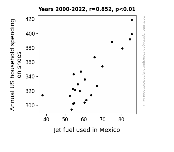 This means 72.5% of the change in the one variable (i.e., Jet fuel used in Mexico) is predictable based on the change in the other (i.e., Annual US household spending on shoes) over the 23 years from 2000 through 2022.