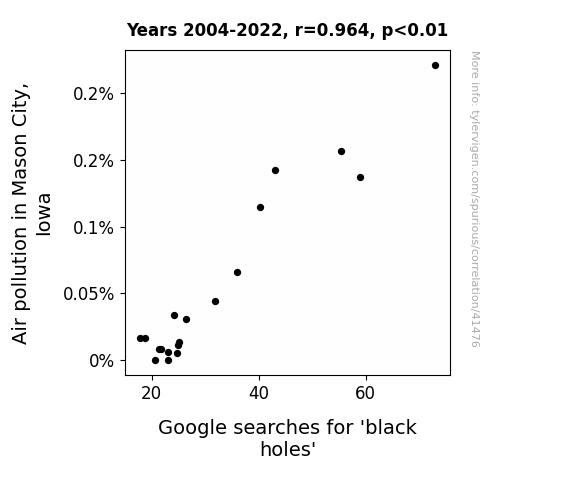 This means 92.9% of the change in the one variable (i.e., Google searches for 'black holes') is predictable based on the change in the other (i.e., Air pollution in Mason City, Iowa) over the 19 years from 2004 through 2022.