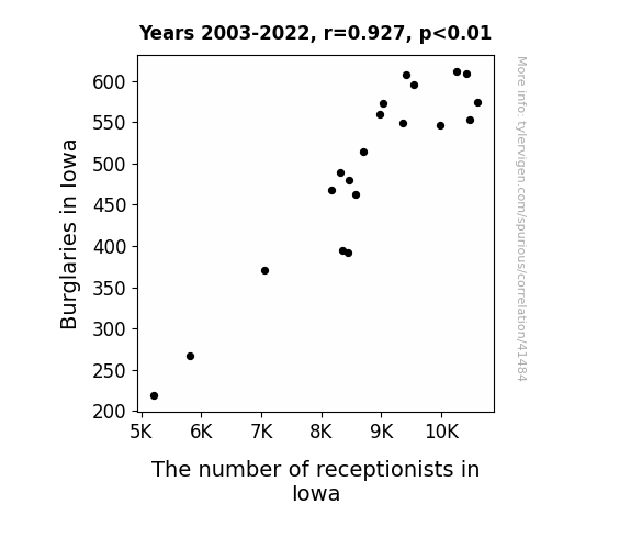 This means 85.8% of the change in the one variable (i.e., The number of receptionists in Iowa) is predictable based on the change in the other (i.e., Burglaries in Iowa) over the 20 years from 2003 through 2022.