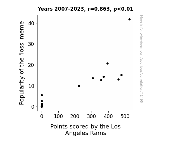 This means 74.4% of the change in the one variable (i.e., Points scored by the Los Angeles Rams) is predictable based on the change in the other (i.e., Popularity of the 'loss' meme) over the 17 years from 2007 through 2023.