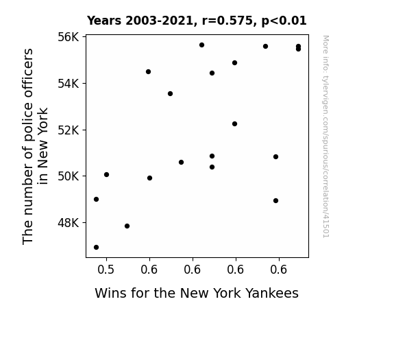 This means 33.1% of the change in the one variable (i.e., Wins for the New York Yankees) is predictable based on the change in the other (i.e., The number of police officers in New York) over the 19 years from 2003 through 2021.