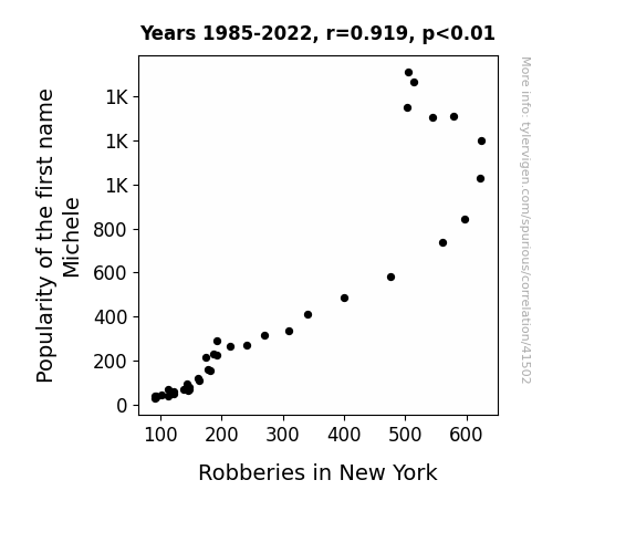 This means 84.4% of the change in the one variable (i.e., Robberies in New York) is predictable based on the change in the other (i.e., Popularity of the first name Michele) over the 38 years from 1985 through 2022.