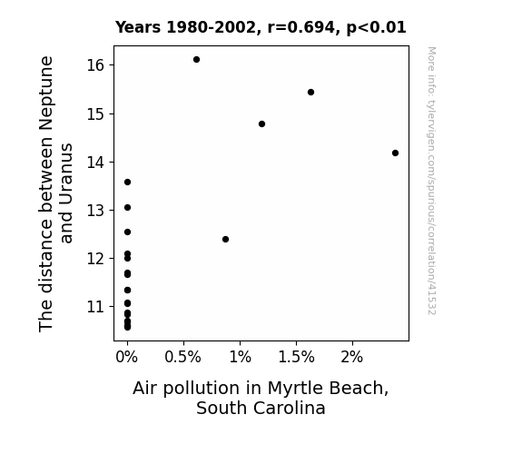 This means 48.2% of the change in the one variable (i.e., Air pollution in Myrtle Beach, South Carolina) is predictable based on the change in the other (i.e., The distance between Neptune and Uranus) over the 23 years from 1980 through 2002.