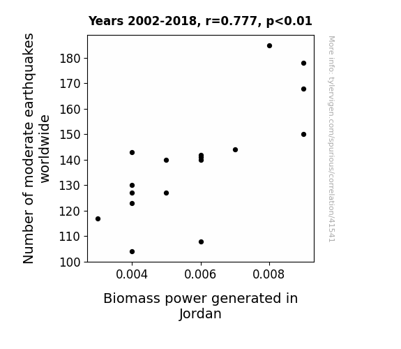 This means 60.4% of the change in the one variable (i.e., Biomass power generated in Jordan) is predictable based on the change in the other (i.e., Number of moderate earthquakes worldwide) over the 17 years from 2002 through 2018.