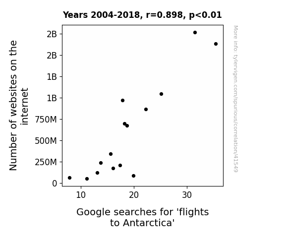 This means 80.6% of the change in the one variable (i.e., Google searches for 'flights to Antarctica') is predictable based on the change in the other (i.e., Number of websites on the internet) over the 15 years from 2004 through 2018.