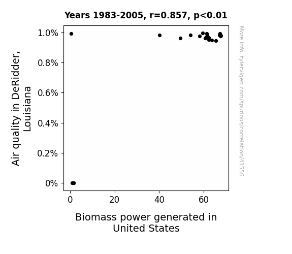 This means 73.4% of the change in the one variable (i.e., Biomass power generated in United States) is predictable based on the change in the other (i.e., Air quality in DeRidder, Louisiana) over the 23 years from 1983 through 2005.