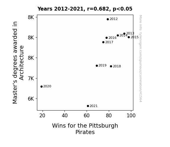 This means 46.5% of the change in the one variable (i.e., Wins for the Pittsburgh Pirates) is predictable based on the change in the other (i.e., Master's degrees awarded in Architecture) over the 10 years from 2012 through 2021.