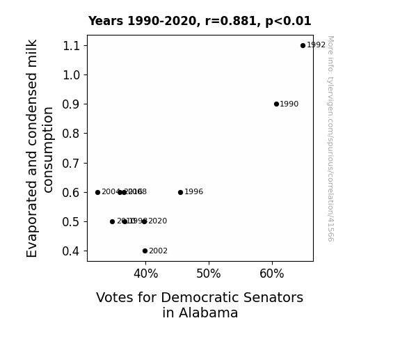 This means 77.5% of the change in the one variable (i.e., Votes for Democratic Senators in Alabama) is predictable based on the change in the other (i.e., Evaporated and condensed milk consumption) over the 10 years from 1990 through 2020.