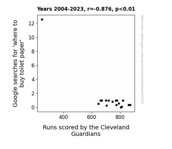This means 76.7% of the change in the one variable (i.e., Runs scored by the Cleveland Guardians) is predictable based on the change in the other (i.e., Google searches for 'where to buy toilet paper') over the 20 years from 2004 through 2023.