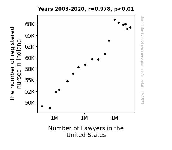 This means 95.6% of the change in the one variable (i.e., Number of Lawyers in the United States) is predictable based on the change in the other (i.e., The number of registered nurses in Indiana) over the 18 years from 2003 through 2020.