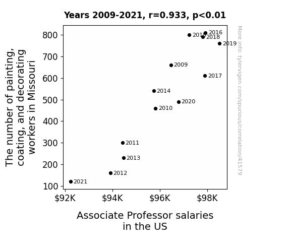 This means 87% of the change in the one variable (i.e., Associate Professor salaries in the US) is predictable based on the change in the other (i.e., The number of painting, coating, and decorating workers in Missouri) over the 13 years from 2009 through 2021.